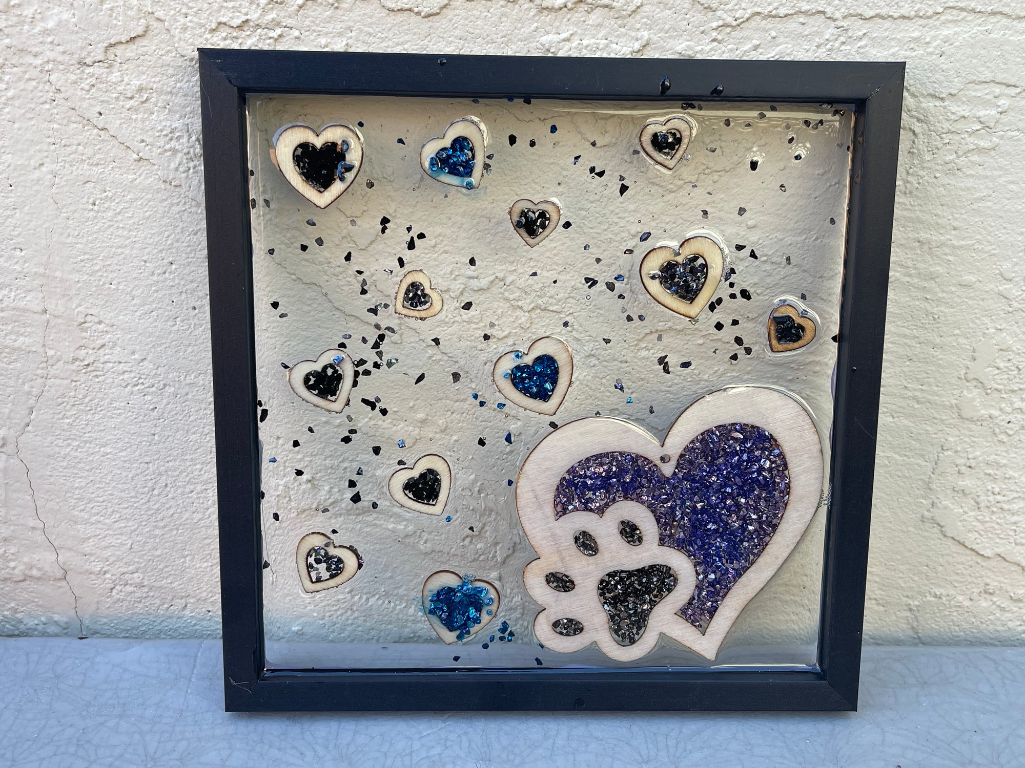 The crushed glass catches and reflects light beautifully, giving the piece a soft shimmer and dimensional look. Each frame is carefully handmade, so every arrangement of hearts is uniquely its own.